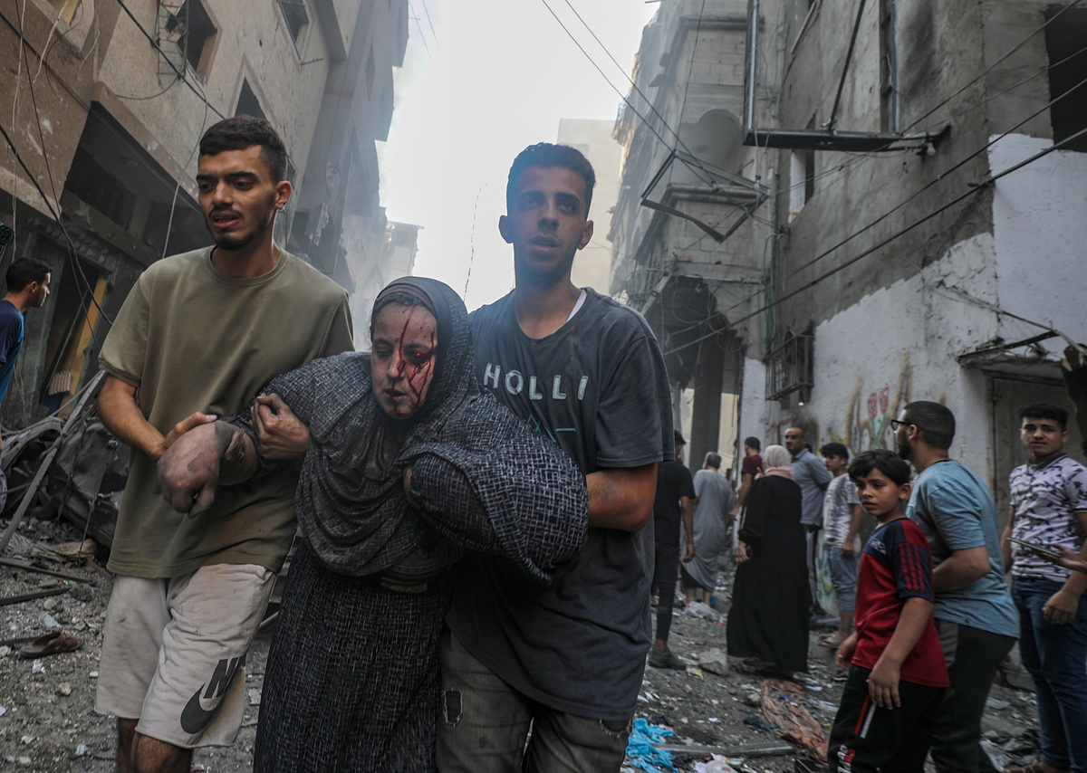 epa10919123 An injured woman is helped away from the site of an Israeli rocket attack in Al-Shati refugee camp in the west of Gaza City on, 14 October 2023. The Israeli Defense Force (IDF) on 13 October called for the evacuation of all civilians of northern Gaza ahead of an expected ground invasion. More than 1,300 Israelis have been killed and over 3,200 others injured, according to the IDF, after the Islamist movement Hamas launched an attack against Israel from the Gaza Strip on 07 October. More than 2,000 Palestinians have been killed and over 8,700 others injured in Gaza since Israel launched retaliatory air strikes, the Palestinian health ministry said. EPA/MOHAMMED SABER