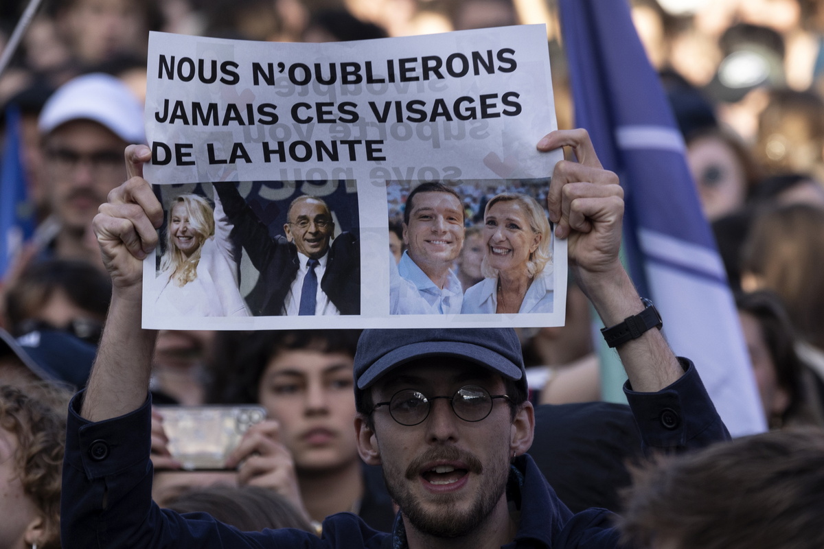 epa11402945 A man carries a placard depicting French Right Wing Politicians and reads in French ‘we will never forget these faces of shame’ during a protest against the French right-wing party National Rally (Rassemblement National or RN) following the results of the European elections, in Paris, France, 10 June 2024. Unions CGT and Left Party called for national protests after the National Rally made significant gains in the European Union parliamentary elections. The European Parliament elections took place across EU member states from 06 to 09 June 2024. EPA/ANDRE PAIN