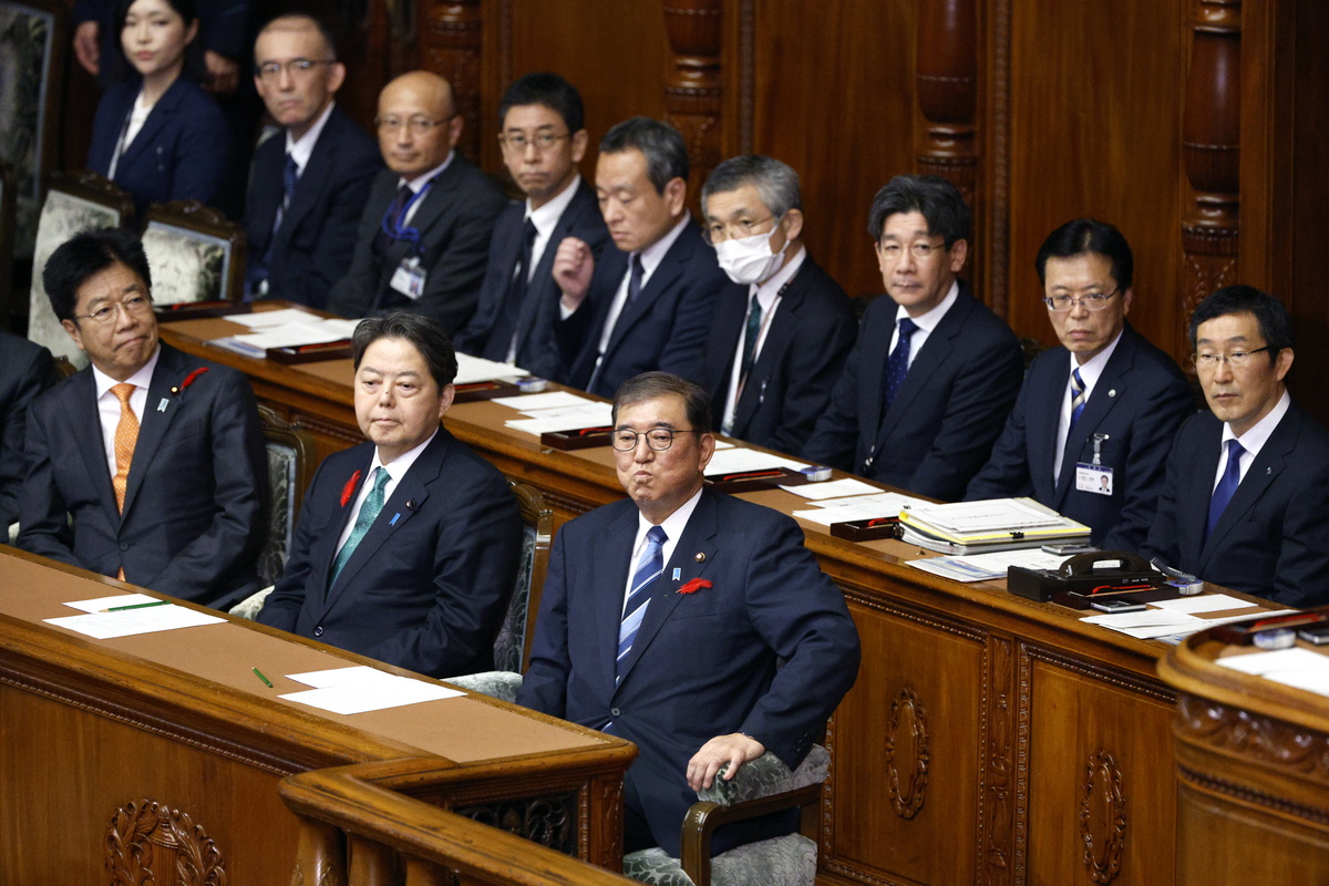 epa11650206 Japanese Prime Minister Shigeru Ishiba (C) reacts as the dissolution of the lower house of the parliament is to be announced, in Tokyo, Japan, 09 October 2024. The lower house elections in Japan are set for 27 October. EPA/FRANCK ROBICHON