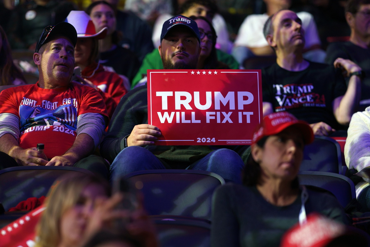 epa11701301 Supporters wait for former US President Donald Trump to attend a rally in Reading, Pennsylvania, USA, 04 November 2024. Trump and US Vice President and Democratic presidential candidate Kamala Harris are tied in the polls ahead of the US presidential election on 05 November. EPA/WILL OLIVER