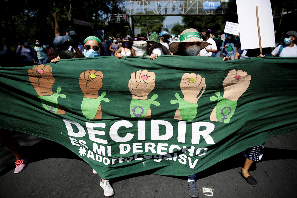 epa09494016 Salvadoran women take part in a demonstration for the right to legal and safe abortion on the International Day for the decriminalization of abortion in San Salvador, El Salvador, 28 September 2021. Salvadoran women marched to demand public policies on sexual and reproductive health and for the right to legal and safe abortion on the International Day for the decriminalization of abortion. EPA/RODRIGO SURA