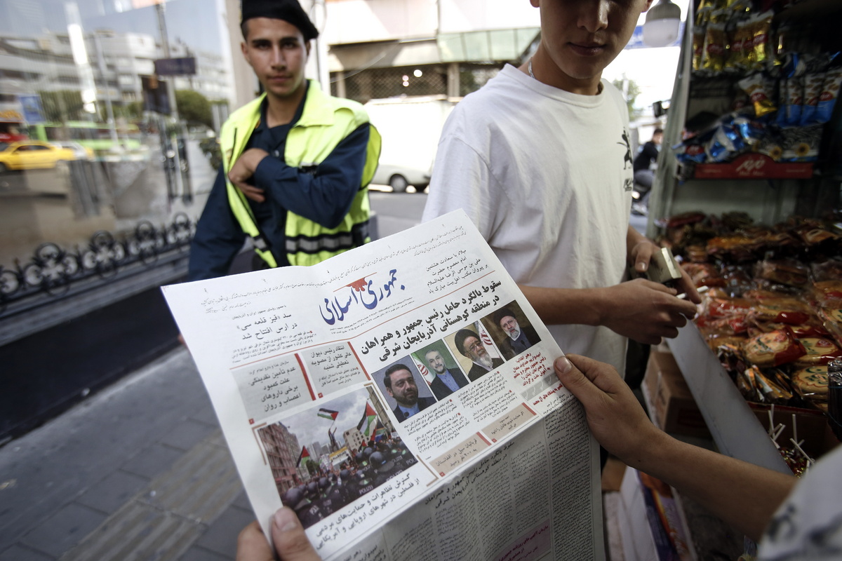epa11354687 People walk past as a man reads a local newspaper, reporting on the crash of the Iranian president's helicopter, outside a kiosk in Tehran, Iran, 20 May 2024. According to Iranian state media, President Raisi, Foreign Minister Hossein Amir-Abdollahian and several others were killed in a helicopter crash in the mountainous Varzaghan area on 19 May, during their return to Tehran, after an inauguration ceremony of the joint Iran-Azerbaijan constructed Qiz-Qalasi dam at the Aras river. EPA/ABEDIN TAHERKENAREH