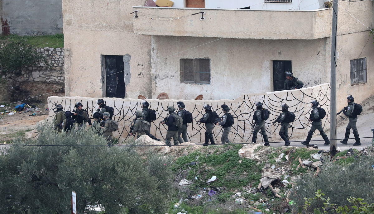 epa10386227 Israeli soldiers take positions during operation to demolish homes belonging to Palestinians accused of killing an Israeli soldier, in the West Bank village of Kafr Dan, near Jenin city, 02 January 2023. The Israeli army said Israeli forces came under attack as they entered the Kafr Dan village to demolish houses of two Palestinians accused of shooting and killing Major Bar Falah in September 2022. The Palestinian Ministry of Health said two Palestinians were killed during the Israeli raid identified as 22-year-old Muhammad Houshiyeh and 25-year-old Fouad Abed. EPA/ALAA BADARNEH 4605