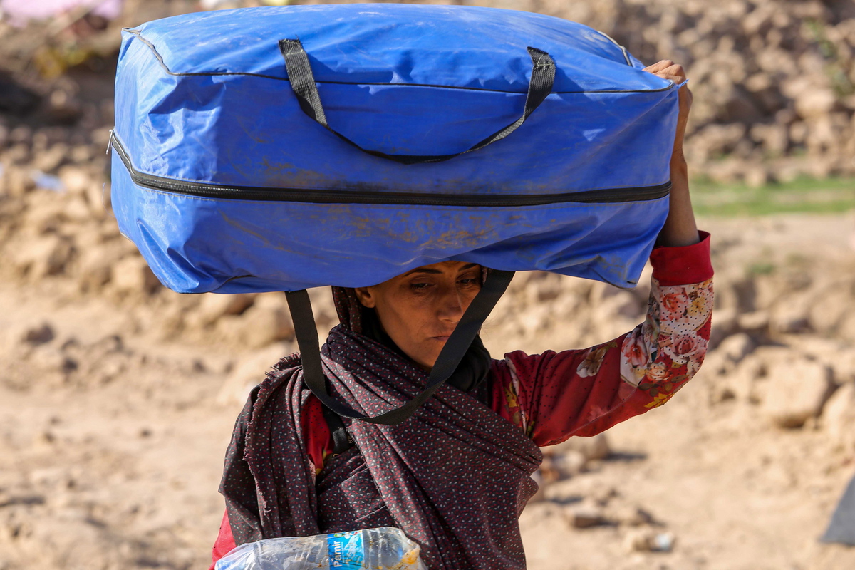 epa10911970 A woman affected by the earthquake carries a tent received in earthquake-hit Zinda Jan district of Herat, Afghanistan, 10 October 2023. A 6.3-magnitude earthquake and the consecutive aftershocks that struck western Afghanistan during the weekend killed nearly 3,000, according to estimates by the government and nonprofit organizations. Over 2,000 people were wounded and 20 villages completely destroyed in the tremors. EPA/SAMIULLAH POPAL