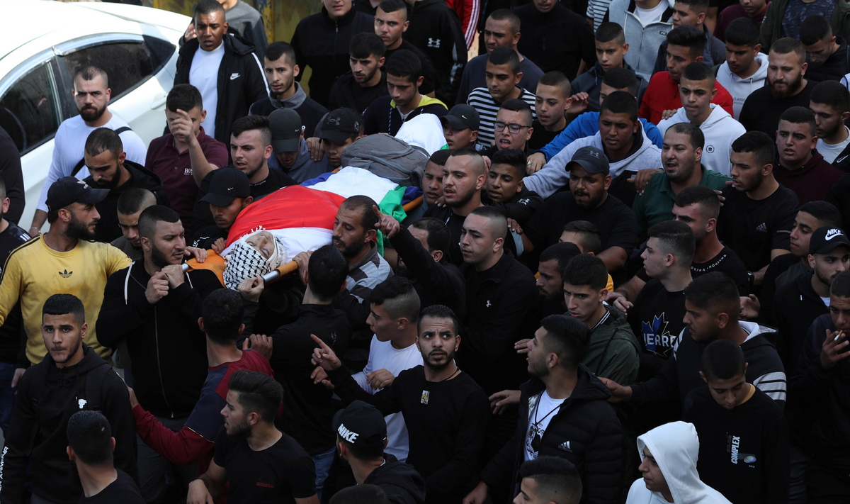 epa10317748 Palestinian mourners carry the body of Mahmoud Al Sadi in Jenin camp, Jenin, 21 November 2022. According to the Palestinian Health Ministry, Al Sadi was killed during a raid by Israeli forces in the Jenin camp. EPA/ALAA BADARNEH