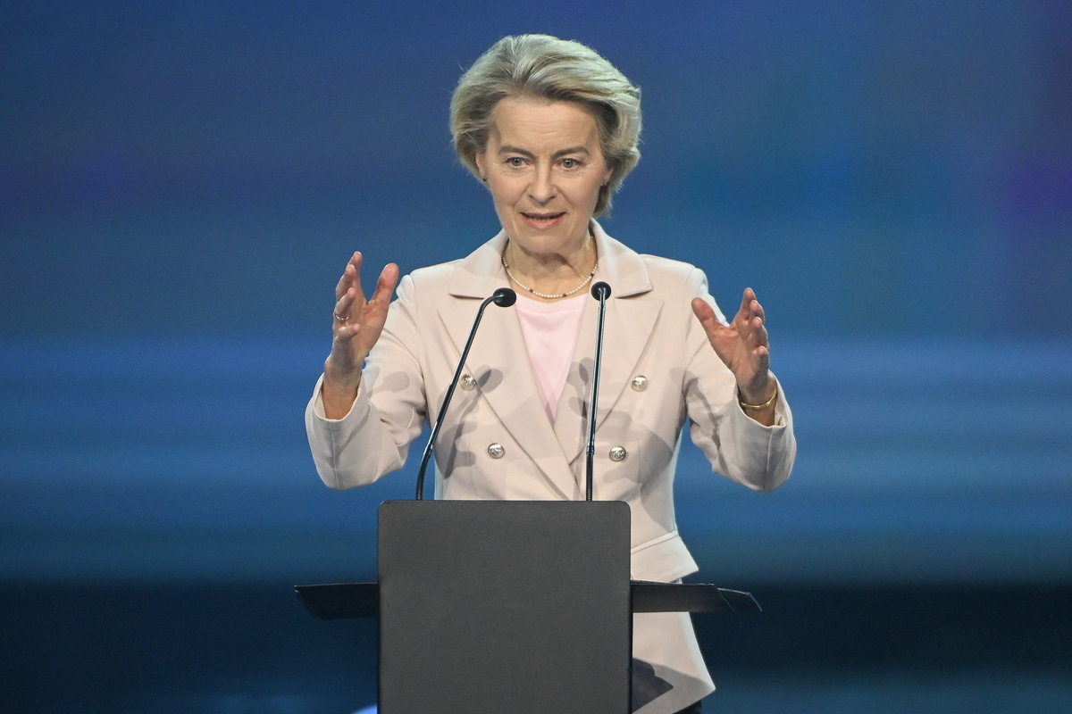 epa11884784 European Commission President Ursula von der Leyen addresses the official ceremony for 'Energy Independence Day', marking Lithuania's integration into the European Energy Network in Vilnius, Lithuania, 09 February 2025. As of today, Estonia, Latvia, and Lithuania are completely independent from the electricity systems of Russia and Belarus, according to a statement from the EU Commission, following their successful integration into the EU internal energy market through the European continental network via Poland. EPA/Marcin Obara POLAND OUT
