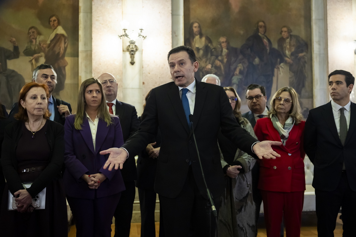 epaselect epa11957184 Portuguese Prime Minister Luis Montenegro talks to the press after the rejection of the government motion of confidence at the Portuguese Parliament in Lisbon, Portugal, 11 March 2025. The motion of confidence comes in response to growing questions about the prime minister's family's business activities. EPA/JOSE SENA GOULAO
