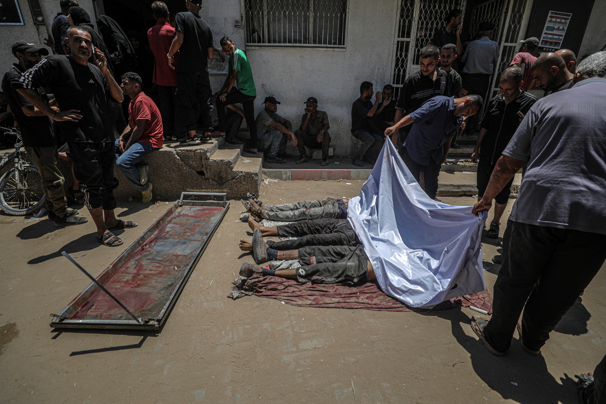 epa12250206 GRAPHIC CONTENT - Bodies of deceased Palestinian men lie in Al-Shifa Hospital after being shot dead at a food distribution point, in Gaza City, 20 July 2025. According to the Palestinian Ministry of Health in Gaza, at least 67 people were killed while trying to receive humanitarian aid in the Zikim area. EPA/MOHAMMED SABER -- ATTENTION EDITORS: GRAPHIC CONTENT --