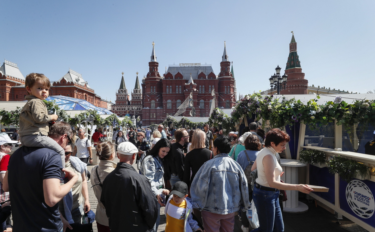 epa10661978 People visit the annual gastronomic festival Fish Week in Moscow 2023, near the Red Square in Moscow, Russia, 29 May 2023. The festival takes place in 23 different venues throughout Moscow and runs through 04 June, presenting different Russian regional products. EPA/YURI KOCHETKOV
