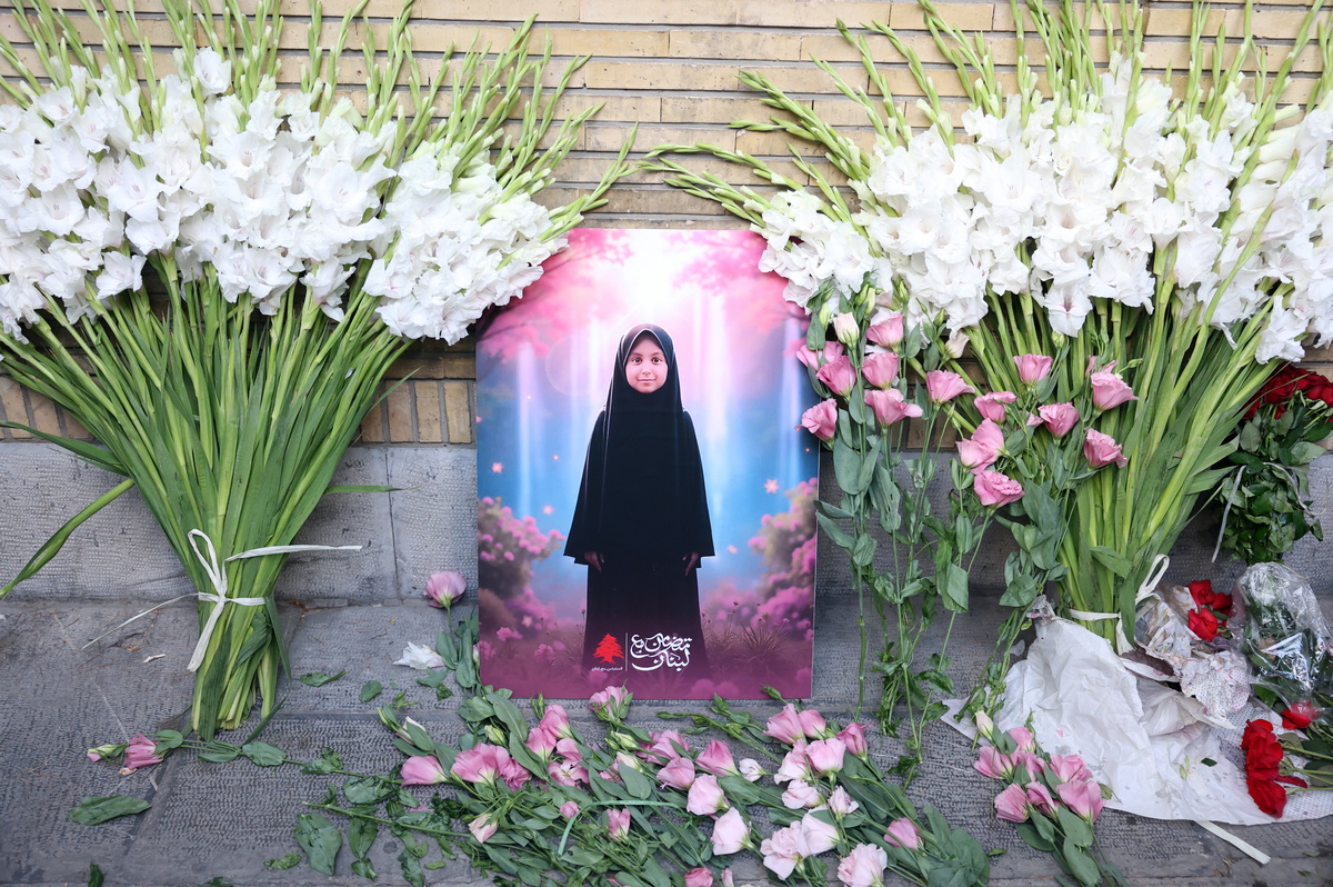 epa11612241 Flowers are placed in front of an image of a child as people demonstrate solidarity with the Lebanese people, outside the Lebanese embassy in Tehran, Iran, 18 September 2024. Lebanon's Ministry of Health said at least 12 people have been killed and more than 2,800 others injured after multiple wireless communication devices (pagers) were detonated on 17 September. Lebanon's Hezbollah declared in a statement that Israel was behind the attack. Iran's Ambassador to Lebanon Mojtaba Amani was among the wounded, Iran's Fars agency reported. EPA/ABEDIN TAHERKENAREH