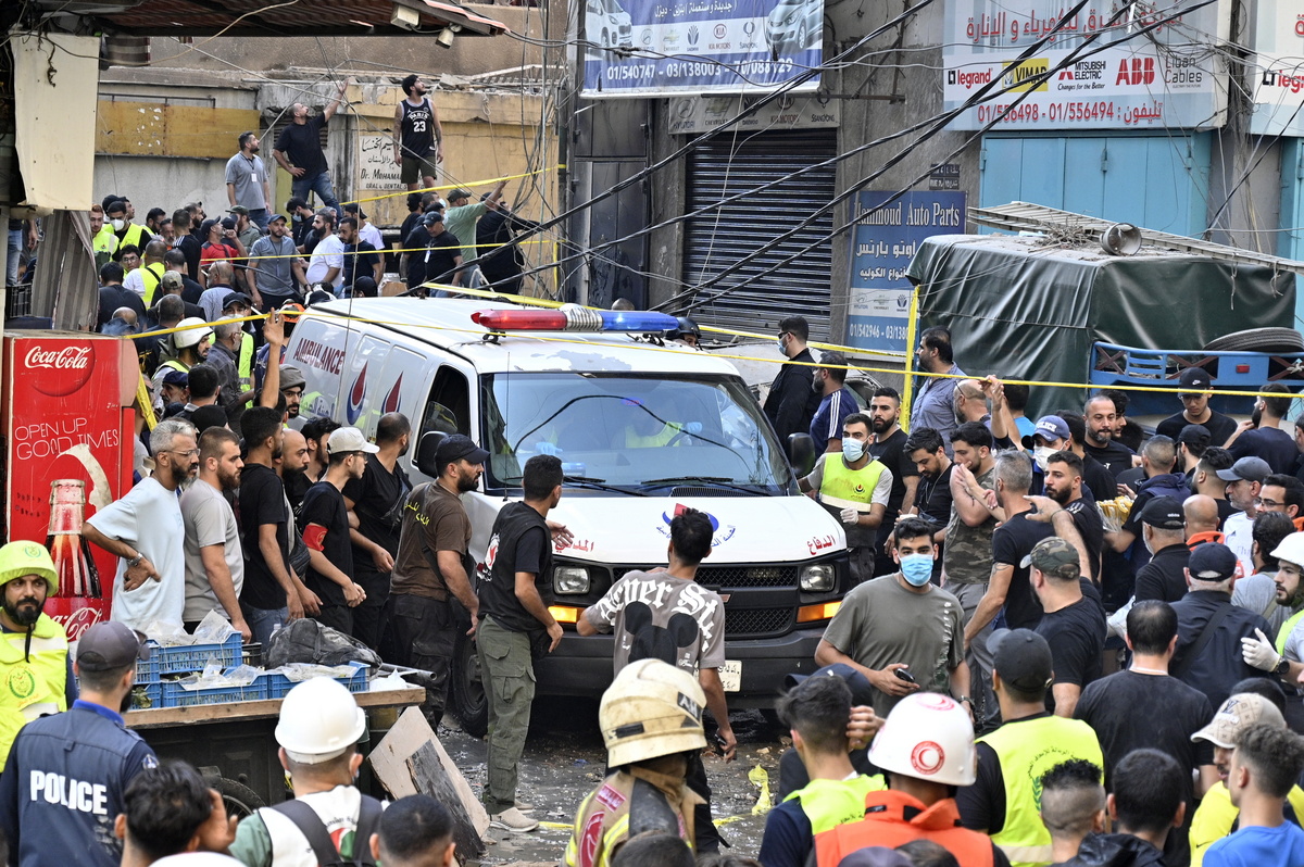 epa11622335 Residents and medics gather at the area after an Israeli military strike, in the Ghobeiry area in the southern suburb of Beirut, Lebanon, 24 September 2024. Lebanon's state media said a number of injuries has been reported after an Israeli strike targeting a six-storey residential building in the Ghobeiry area in the southern suburb of Beirut. The Israeli Defense Forces (IDF) said they conducted a 'targeted strike' in Beirut on 24 September. According to Lebanon's Ministry of Health, at least 558 people have been killed and more than 1,835 have been injured following continued airstrikes on southern Lebanese towns and villages. EPA/WAEL HAMZEH