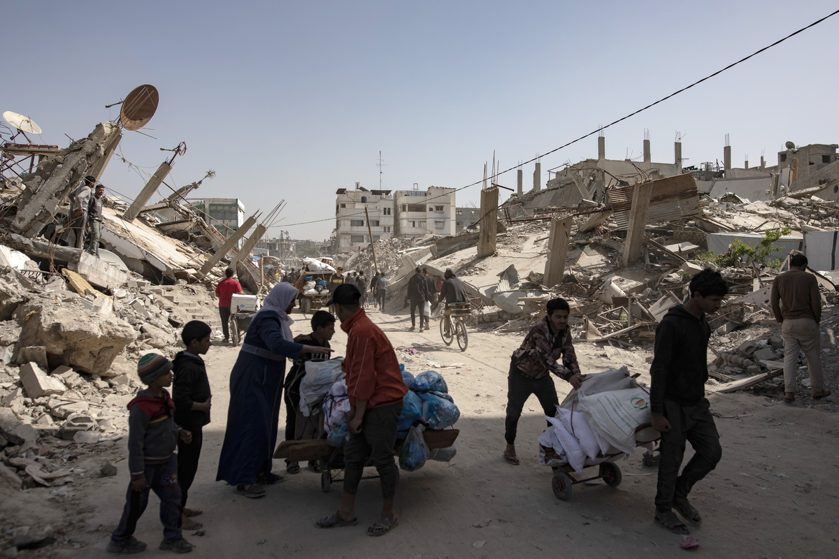 epaselect epa12007606 Internally displaced Palestinians carry their belongings as they flee the Shejaiya neighborhood, east of Gaza City, 03 April 2025, after an evacuation order issued by the Israeli military. Israeli forces resumed airstrikes on Gaza on 18 March, ending a ceasefire that had been in place since 19 January. EPA/HAITHAM IMAD