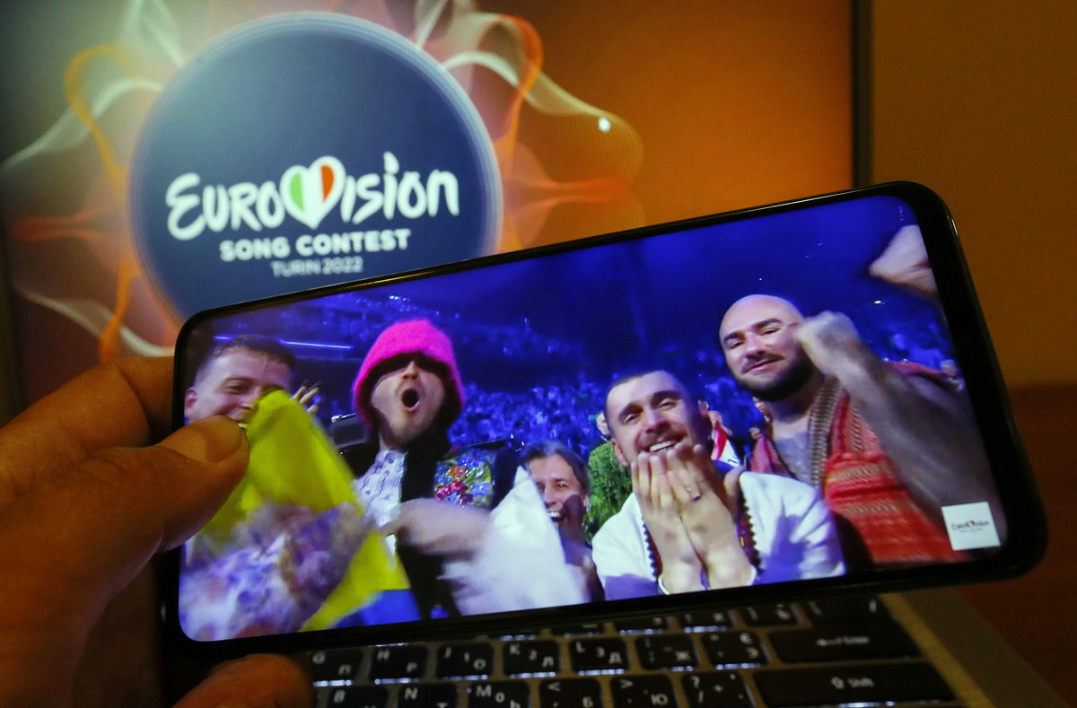 epa09948024 A Ukrainian man watches a broadcast on his mobile phone as Kalush Orchestra from Ukraine celebrates winning the 66th annual Eurovision Song Contest (ESC), in Odesa, Ukraine, early 15 May 2022. Ukrainians could not gather to watch the ESC 2022 this year due to a curfew and big numbers of evacuated people amid the Russian invasion. On 24 February, Russian troops invaded Ukrainian territory starting a conflict that has provoked destruction and a humanitarian crisis. According to the UNHCR, more than six million refugees have fled Ukraine and a further 7.7 million people have been displaced internally within Ukraine since. EPA/STEPAN FRANKO