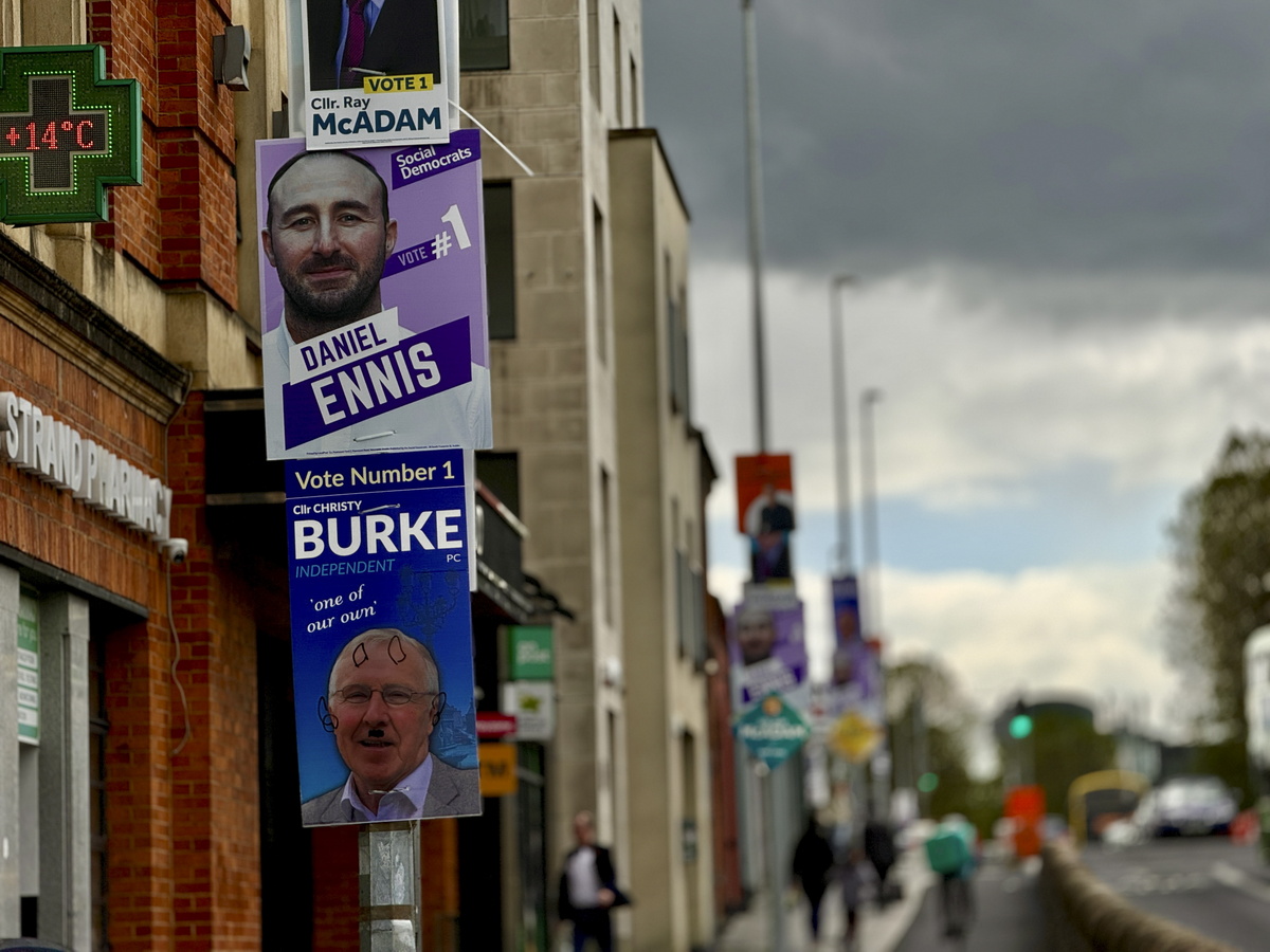 epa11394464 Campaign posters in Dublin, Ireland, 05 June 2024 (issued 06 June 2024). There are around 100 candidates running for local elections in Ireland who are from a migrant background. Ireland is holding European and local elections on 07 June 2024. EPA/MOSTAFA DARWISH