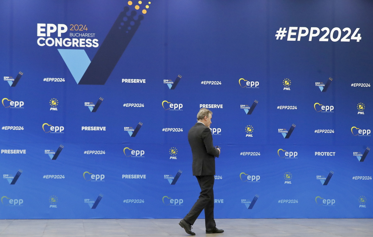 epa11201506 A participant walks in front of a huge banner before the start of the European People's Party Congress in Bucharest, Romania, 06 March 2024. The European People's Party (EPP) party hold its Congress in Romania's capital on 06 and 07 March, to choose their candidates for the EU Parliament elections, and as well their nominees for the EU leadership. European Union parliamentary elections will take place from 06 until 09 June 2024. EPA/ROBERT GHEMENT