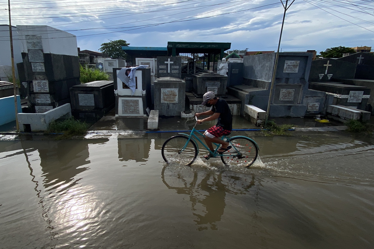 epa10276398 A Filipino on a bicycle wades in a flooded cemetery on the eve of All Saints day in the typhoon-hit town of Kawit, Cavite province, Philippines, 31 October 2022. Officials from the government health department warned cemetery goers to observe COVID-19 safety protocol following the opening and allowing cemetery visitations after two years of pandemic. Millions of Filipinos will flock to cemeteries around the country to visit departed relatives and loved ones to mark All Saints Day and All Souls Day on 01 and 02 November. EPA/FRANCIS R. MALASIG