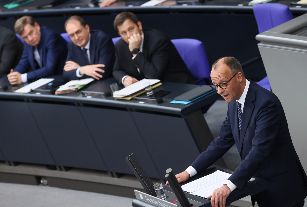 epa12099004 German Chancellor Friedrich Merz (R) delivers a government statement during a session of the German parliament 'Bundestag' in Berlin, Germany, 14 May 2025. EPA/HANNIBAL HANSCHKE