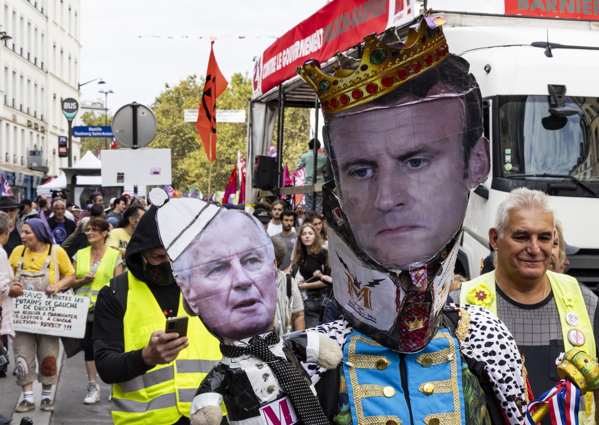 epa11617512 Protesters hold an placard of the Prime Minister Michel Barnier and French President Emmanuel Macron during a protest, in Paris, France, 21 September 2024. Newly appointed French Prime Minister Michel Barnier communicated the list of names of his proposed government to the French President Emmanuel Macron on 20 September. The approval of this list is expected to be in the next few days. The French left parties coalition, Nouveau Front Populaire (NFP), which had arrived ahead in the last legislative elections but fell short of a full majority, called for rallies on 21 September, as they say that their win was not taken in consideration in the formation of the new cabinet. EPA/ANDRE PAIN