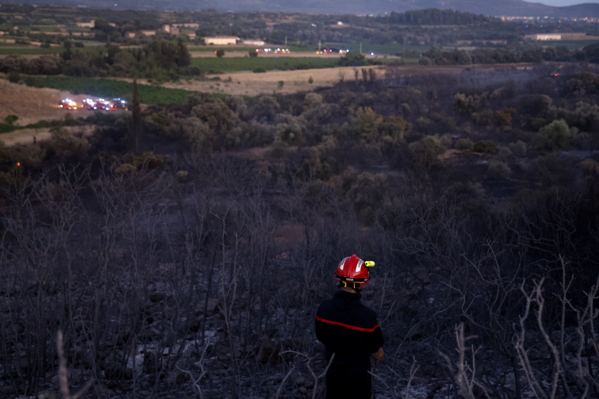 epa12269362 Firefighter looks at land burned by a forest fire in Cournonsec, near Montpellier, France, 28 July 2025. The wildfire has burned more than 300 hectares of vegetation, but is now under control, according to an update by the Fire Department. EPA/Guillaume Horcajuelo