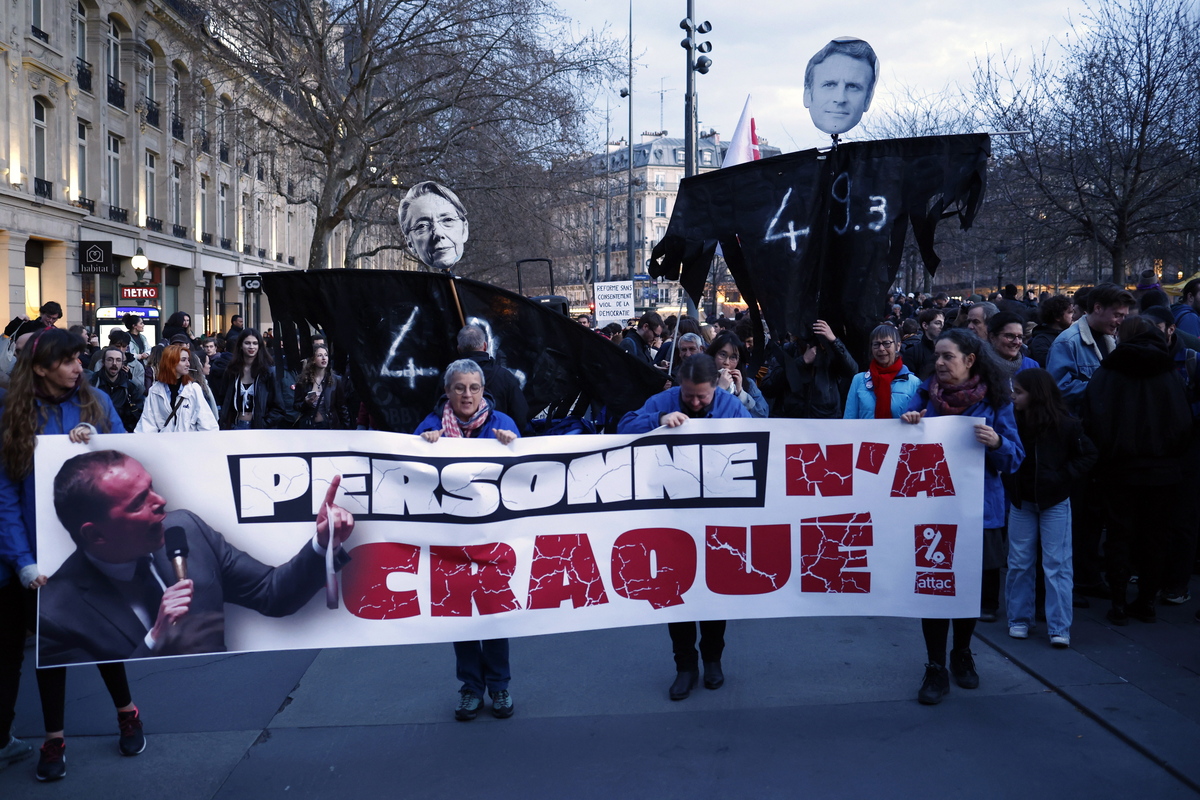 epa10535579 Protesters march behind a banner showing French Labour Minister Olivier Dussopt during a demonstration against the government pension reform in Paris, France, 21 March 2023. Protests continued in France after the French prime minister announced on 16 March 2023 the use of Article 49 paragraph 3 (49.3) of the French Constitution to have the text on the controversial pension reform law be definitively adopted without a vote in the National Assembly (lower house of parliament). The bill would raise the retirement age in France from 62 to 64 by 2030. EPA/YOAN VALAT