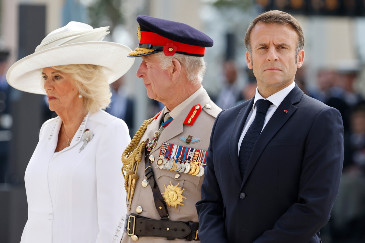 epa11392879 Britain's King Charles III (C), Britain's Queen Camilla (L) and France's President Emmanuel Macron attend the UK Ministry of Defence and the Royal British Legion’s commemorative ceremony marking the 80th anniversary of the World War II 'D-Day' Allied landings in Normandy, at the World War II British Normandy Memorial near the village of Ver-sur-Mer which overlooks Gold Beach in northwestern France, 06 June 2024. The D-Day ceremonies on 06 June this year mark the 80th anniversary since the launch of 'Operation Overlord', a vast military operation by Allied forces in Normandy, which turned the tide of World War II, eventually leading to the liberation of occupied France and the end of the war against Nazi Germany. EPA/LUDOVIC MARIN / POOL MAXPPP OUT