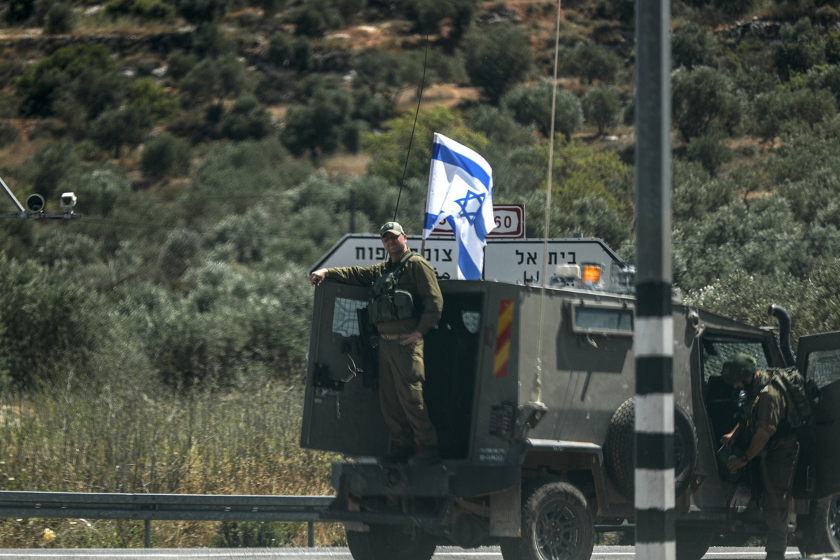 epa10713391 Israeli soldiers guard a junction on Route 60 near the West Bank settlement of Elid, north of Ramallah, 27 June 2023. Israel's Civil Administration Higher Planning Committee (HPC) approved on 26 June the promotion of 5,623 new housing units in the Israeli settlements in the occupied West Bank, including 1,428 in the Eli settlement. EPA/ATEF SAFADI