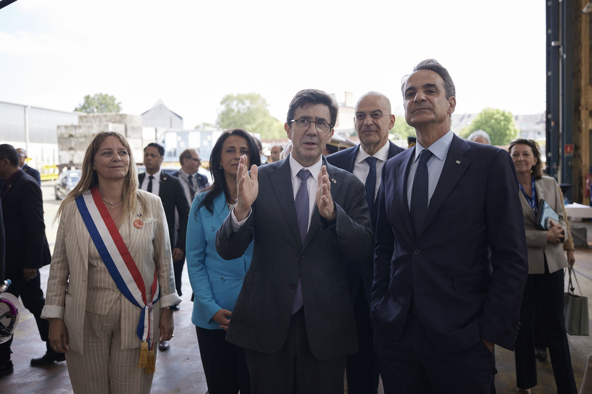 Συνοδευόμενος από τον Υπουργό Εθνικής Άμυνας Νίκο Δένδια και την Υφυπουργό, Εξωτερικών της Γαλλίας Χρυσούλα Ζαχαροπούλου, ο Κυριάκος Μητσοτάκης ενημερώθηκε από τον Πρόεδρο και Διευθύνοντα Σύμβουλο της Naval Group, Pierre Eric Pommellet και τον Αντιπρόεδρο Olivier de la Bourdonnaye, για την πορεία των εργασιών και το χρονοδιάγραμμα παράδοσης των Belharra.