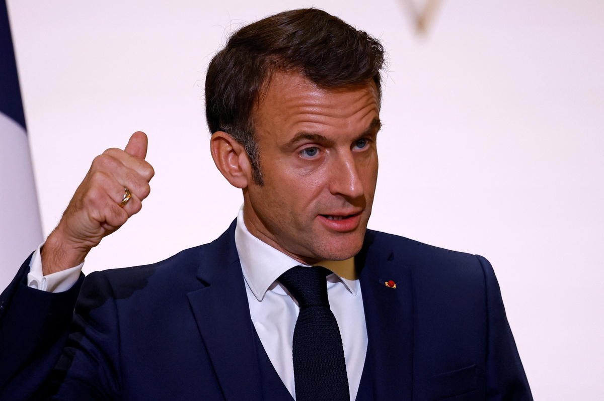 epa10987368 French President Emmanuel Macron gestures as he delivers a speech during a meeting with heads of Small and Medium Enterprises (PME), members of professional federations and local elected officials to launch of the new ETIncelles program to win the export battle, at the Elysee Palace in Paris, France, 21 November 2023. EPA/SARAH MEYSSONNIER / POOL MAXPPP OUT