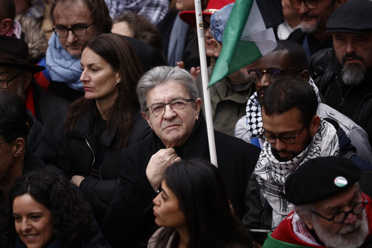 epa11209219 French left-wing La France Insoumise (LFI) party leader Jean-Luc Melenchon (C) demonstrates during a rally to call for a ceasefire in Gaza and in support of the Palestinian people in Paris, France, 09 March 2024. Thousands of Israelis and Palestinians have been killed since the militant group Hamas launched an unprecedented attack on Israel from the Gaza Strip on 07 October 2023, and the Israeli strikes on the Palestinian enclave which followed it. EPA/YOAN VALAT
