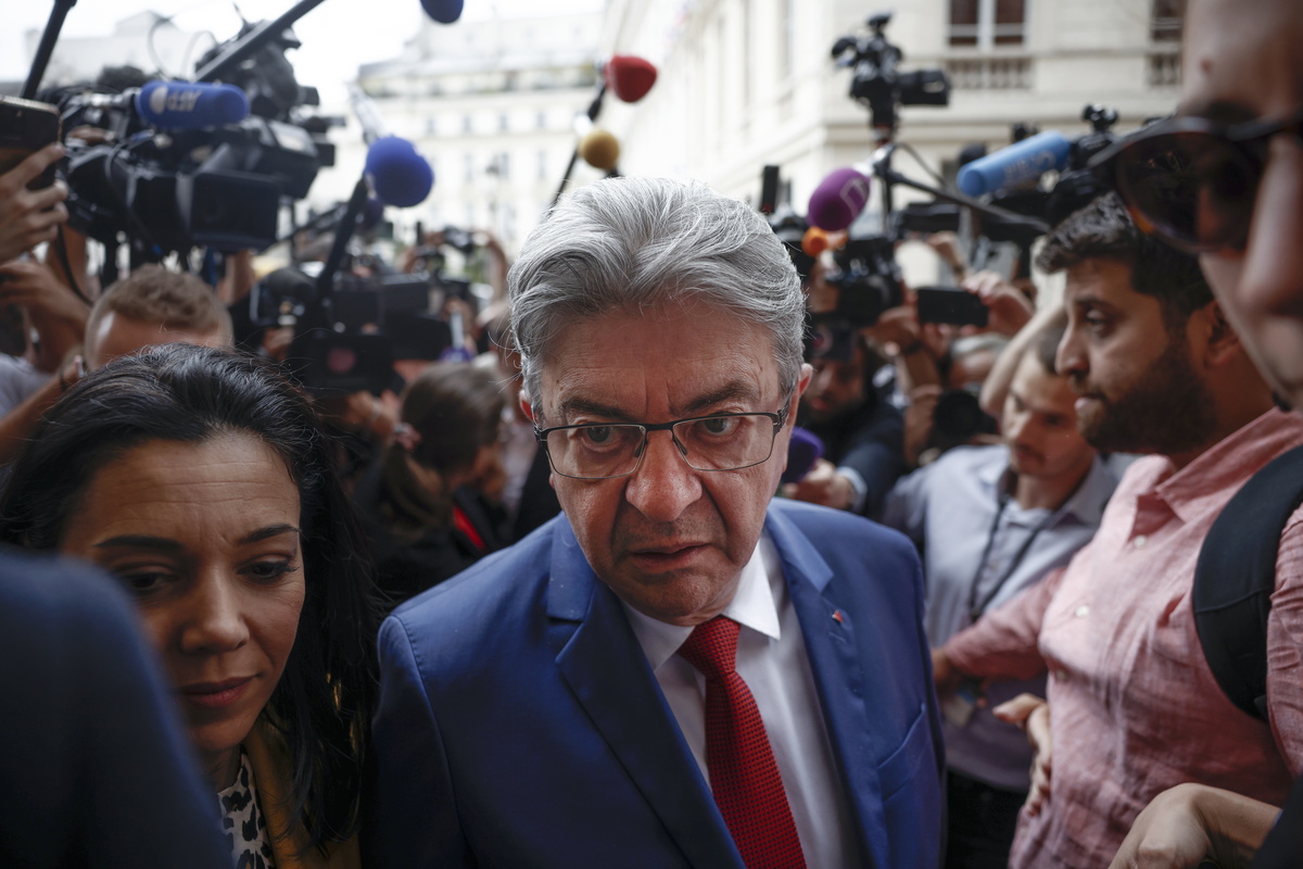 epa11467955 Leader of the left-wing party La France Insoumise (LFI) Jean-Luc Melenchon (C) arrives at the National Assembly in Paris, France, 09 July 2024. France voted in the second round of the legislative elections on 07 July. According to the official results, the left-wing New Popular Front (Nouveau Front populaire, NFP) was ahead of President Macron's party and Le Pen's far-right National Rally (RN). EPA/YOAN VALAT