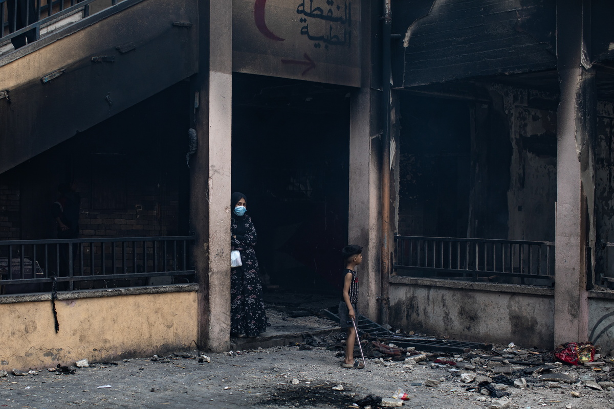 Μέσα στο νοσοκομείο, που δεν λειτουργεί παρά μόνο εν μέρει, εξαιτίας των μεγάλων ελλείψεων, προσφέρονταν φροντίδες σε αιμόφυρτα παιδιά.
