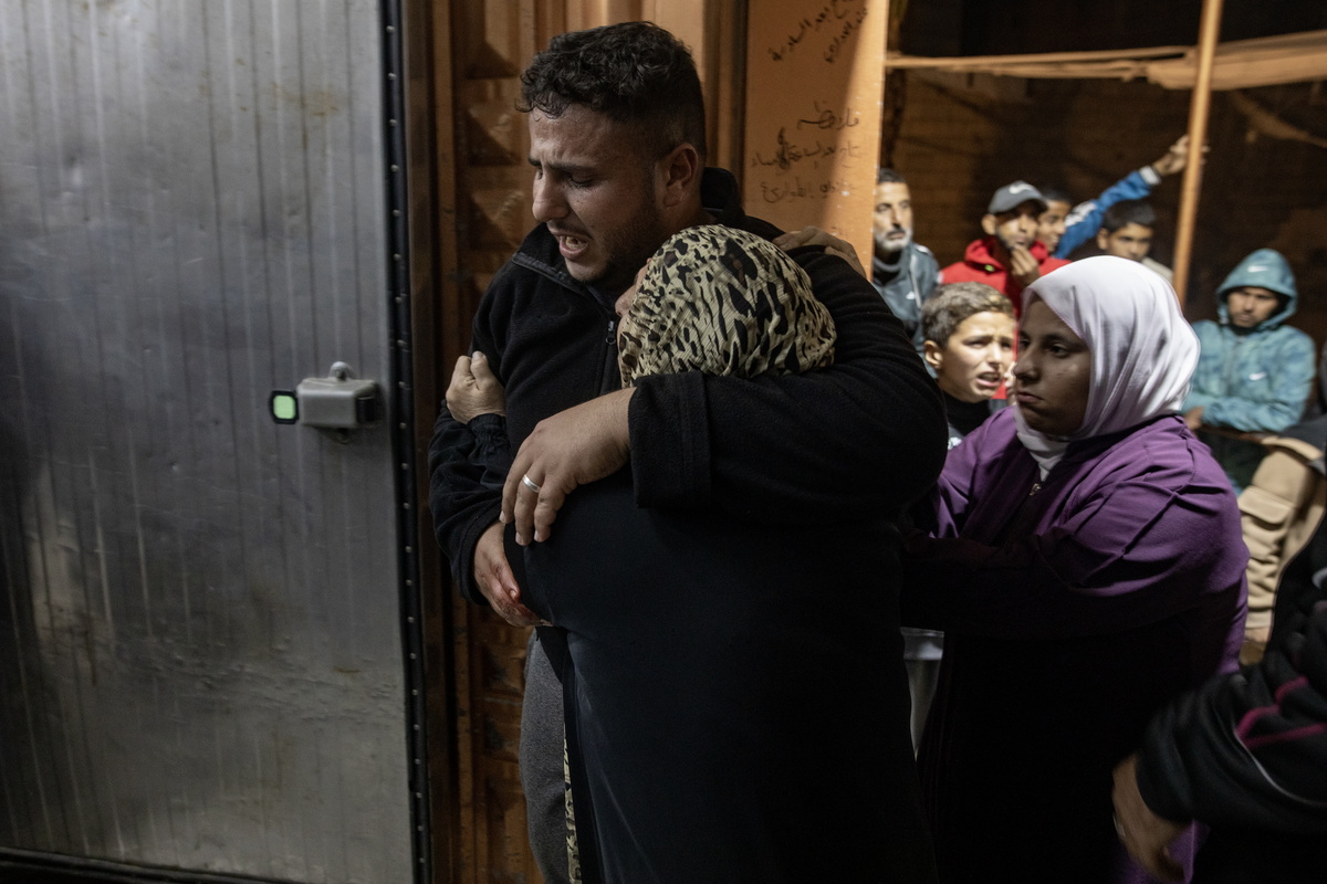 epa12636610 Palestinians gather inside the morgue of Nasser Hospital to identify the bodies of five people who were killed after Israeli army shelling targeted various areas of Khan Yunis, southern Gaza Strip, 08 January 2026, amid a ceasefire between Israel and Hamas. EPA/HAITHAM IMAD