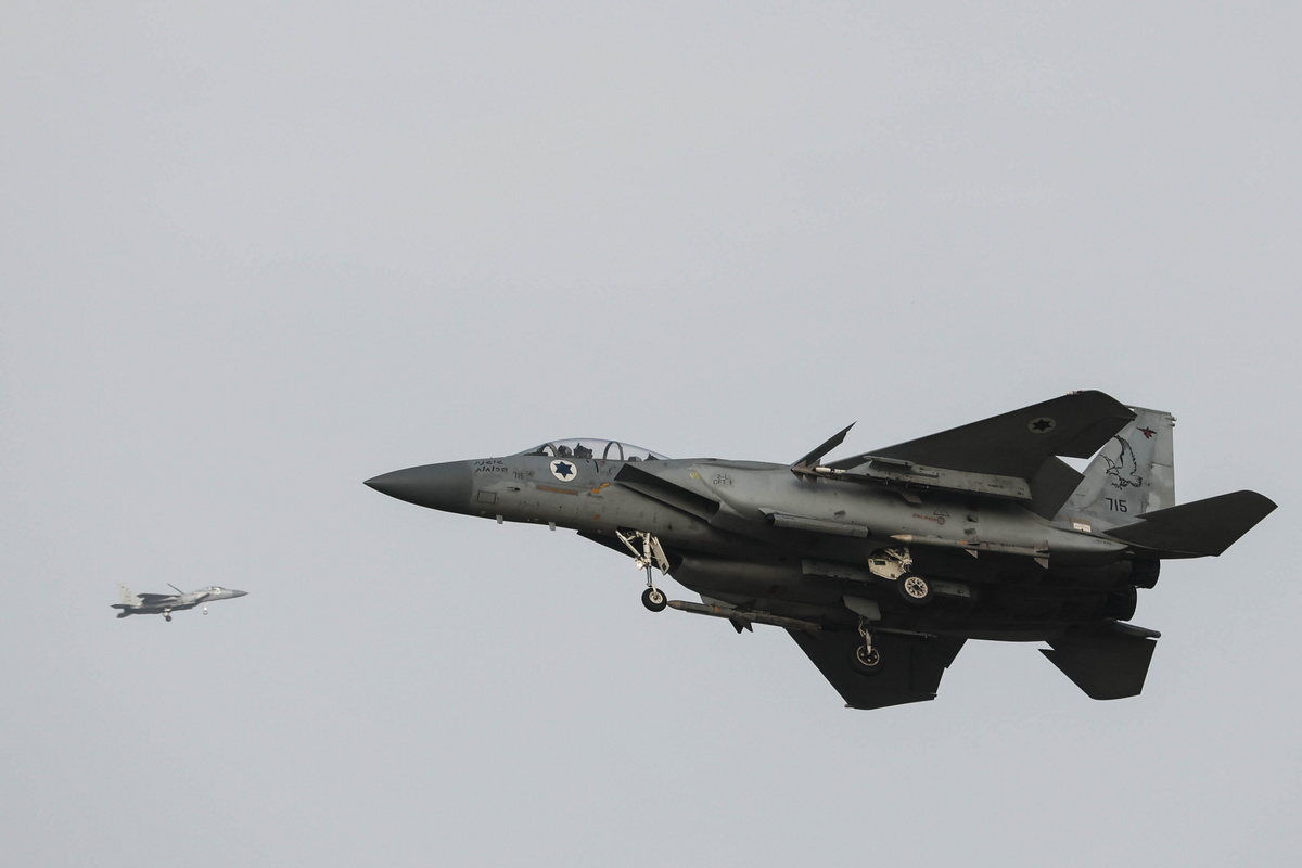 epa11246859 Two Israeli Air Force F15 fighter jets in the air near the city of Gedera, southern Israel, 27 March 2024. The Israeli Defence Forces announced that the Israeli Air Force is to resume its training program for the current year of war, including increased readiness for conflict in the northern areas. More than 30,000 Palestinians and over 1,300 Israelis have been killed, according to the Palestinian Health Ministry and the Israel Defense Forces (IDF), since Hamas militants launched an attack against Israel from the Gaza Strip on 07 October 2023, and the Israeli operations in Gaza and the West Bank which followed it. EPA/ABIR SULTAN