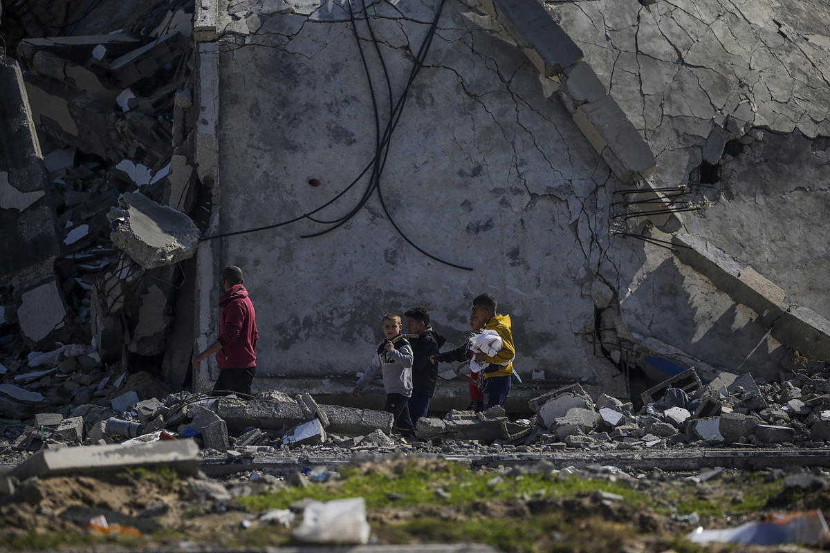 epa11131174 A Palestinian man and his sons inspecting their destroyed house following an Israeli air strike on the Al Maghazi refugee camp, southern Gaza Strip, 06 February 2024. More than 27,000 Palestinians and over 1,300 Israelis have been killed, according to the Palestinian Health Ministry and the Israel Defense Forces (IDF), since Hamas militants launched an attack against Israel from the Gaza Strip on 07 October 2023, and the Israeli operations in Gaza and the West Bank which followed it. EPA/MOHAMMED SABER