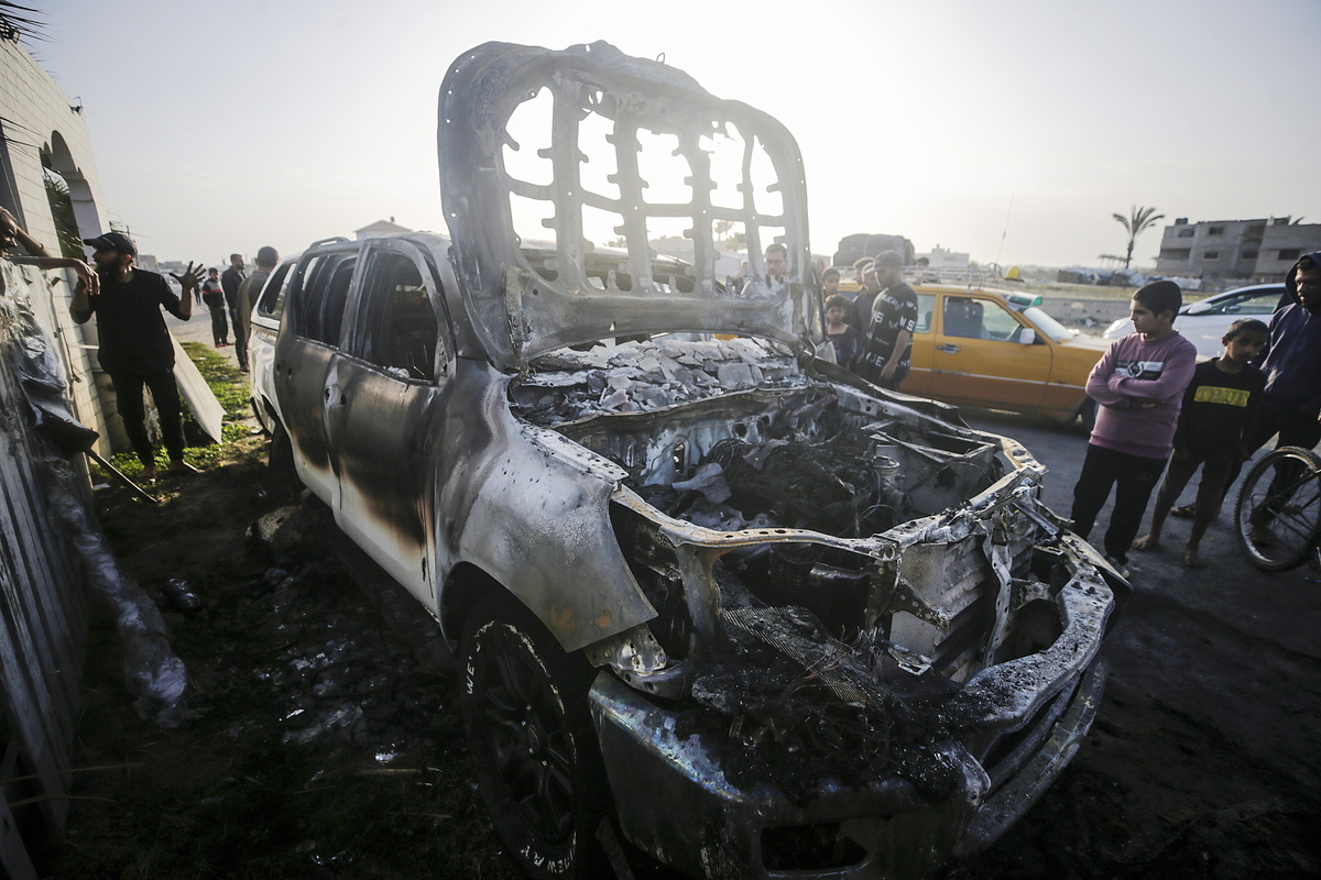 epa11255142 People stand near a destroyed car of the NGO World Central Kitchen (WCK) along Al Rashid road, between Deir Al Balah and Khan Younis in the southern Gaza Strip, 02 April 2024. According to the Palestinian Red Crescent, at least four people from the NGO World Central Kitchen (WCK) were killed when a missile hit their convoy in Deir al Balah while they were on their way from Rafah to Gaza City to receive fresh aid delivered by the Open Arms vessel. The victims were confirmed to be a British, a Polish and an Australian citizen, while the nationality of the fourth victim was still unknown. EPA/MOHAMMED SABER