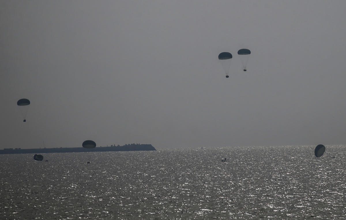 epa11182848 Humanitarian aid is air-dropped by a Jordanian aircraft into the sea off the southern Gaza Strip, 26 February 2024. More than 29,600 Palestinians and over 1,300 Israelis have been killed, according to the Palestinian Health Ministry and the Israel Defense Forces (IDF), since Hamas militants launched an attack against Israel from the Gaza Strip on 07 October 2023, and the Israeli operations in Gaza and the West Bank which followed it. EPA/MOHAMMED SABER