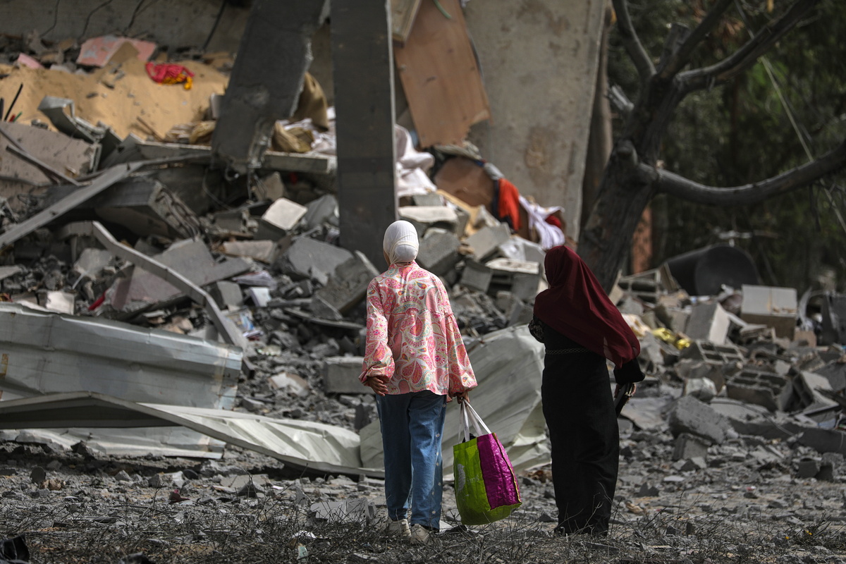 epa11286351 Palestinians return to Al Nusairat refugee camp after the Israeli army’s withdrawal from the area, southern Gaza Strip, 18 April 2024. More than 33,900 Palestinians and at least 1,450 Israelis have been killed, according to the Palestinian Health Ministry and the Israel Defense Forces (IDF), since Hamas militants launched an attack against Israel from the Gaza Strip on 07 October 2023, and the Israeli operations in Gaza and the West Bank which followed it. EPA/MOHAMMED SABER