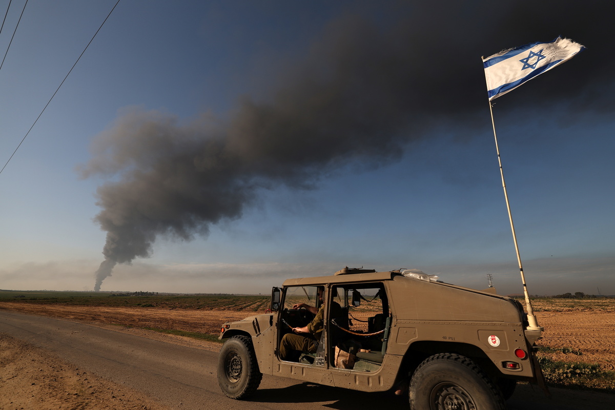 epaselect epa11094179 Israeli troops patrolling along the southern part of the border with the Gaza Strip, as smoke billows from the area near Khan Yunis in the background, 21 January 2024. More than 25,000 Palestinians and at least 1,300 Israelis have been killed, according to the Palestinian Health Ministry and the Israel Defense Forces (IDF), since Hamas militants launched an attack against Israel from the Gaza Strip on 07 October, and the Israeli operations in Gaza and the West Bank which followed it. EPA/ATEF SAFADI