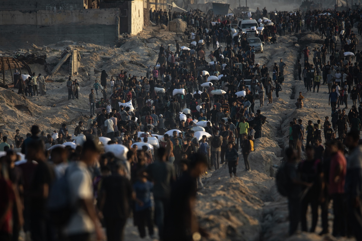 epa12181916 Displaced Palestinians carry bags of flour along Rashid Street in western Jabalia, 17 June, 2025, after humanitarian aid trucks entered the northern Gaza Strip through the Israeli-controlled Zikim crossing, northwest of Gaza City. EPA/HAITHAM IMAD