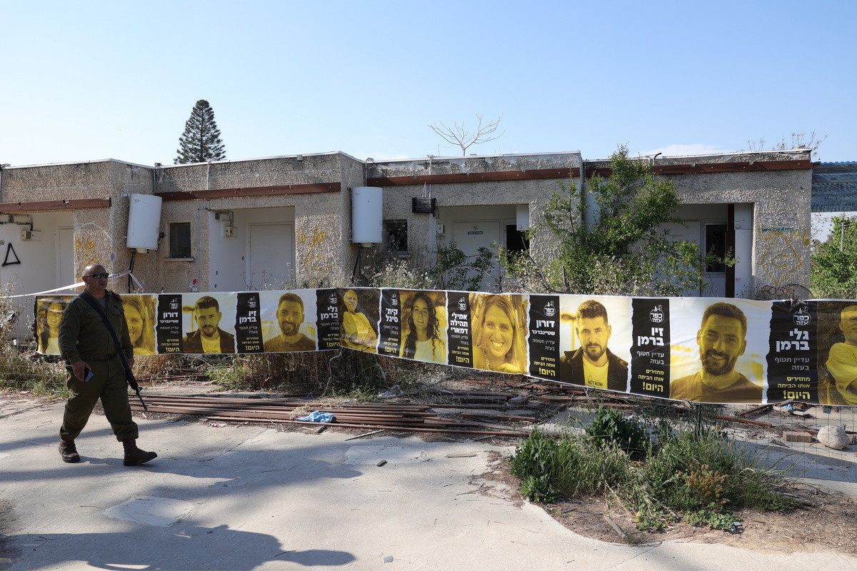 epa11264167 Pictures are displayed of Israeli hostages held by Hamas in Gaza since the October 07 attack in Kibbutz Kfar Aza, near the border with Gaza in southern Israel, 07 April 2024. Israel marks six months since the October 07 attack. According to Israeli IDF 134 israeli hostages are being held by Hamas in Gaza. EPA/ABIR SULTAN