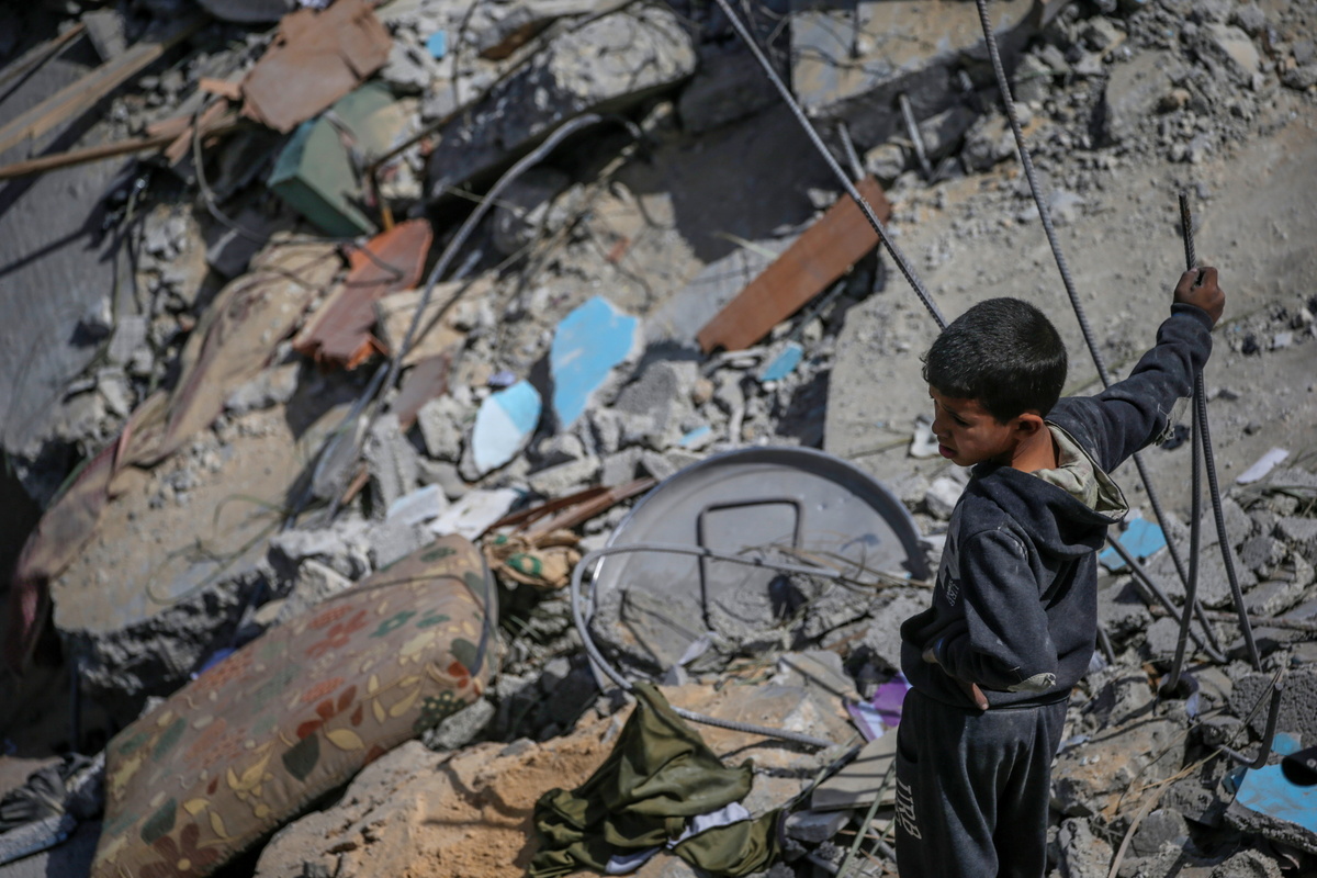epa11252973 A Palestinian boy inspects his destroyed family house following an Israeli air strike, in Al Maghazi refugee camp, southern Gaza Strip, 31 March 2024. According to the Palestinian Civil Defense, a large-scale operation targeting a residential house in the Al Maghazi refugee camp killed more than 10 Palestinians, most of them displaced persons, and more than 15 others were wounded. More than 32,700 Palestinians and over 1,450 Israelis have been killed, according to the Palestinian Health Ministry and the Israel Defense Forces (IDF), since Hamas militants launched an attack against Israel from the Gaza Strip on 07 October 2023, and the Israeli operations in Gaza and the West Bank which followed it. EPA/MOHAMMED SABER
