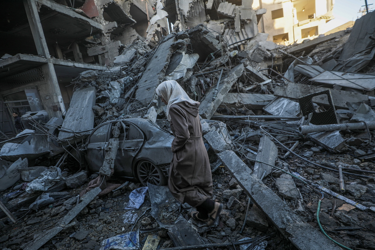 epaselect epa11774221 A Palestinian woman walks among the rubble of destroyed buildings following Israeli airstrikes in Al Nuseirat refugee camp, central Gaza Strip, 13 December 2024. According to the Palestinian Ministry of Health in Gaza, at least 40 Palestinians were killed in an overnight Israeli airstrike in Al Nusairat refugee camp, central Gaza. More than 45,500 Palestinians and over 1,400 Israelis have been killed, according to the Palestinian Health Ministry and the Israeli Army, since Hamas militants launched an attack against Israel from the Gaza Strip on 07 October 2023 and the Israeli operations in Gaza and the West Bank that followed it. EPA/MOHAMMED SABER