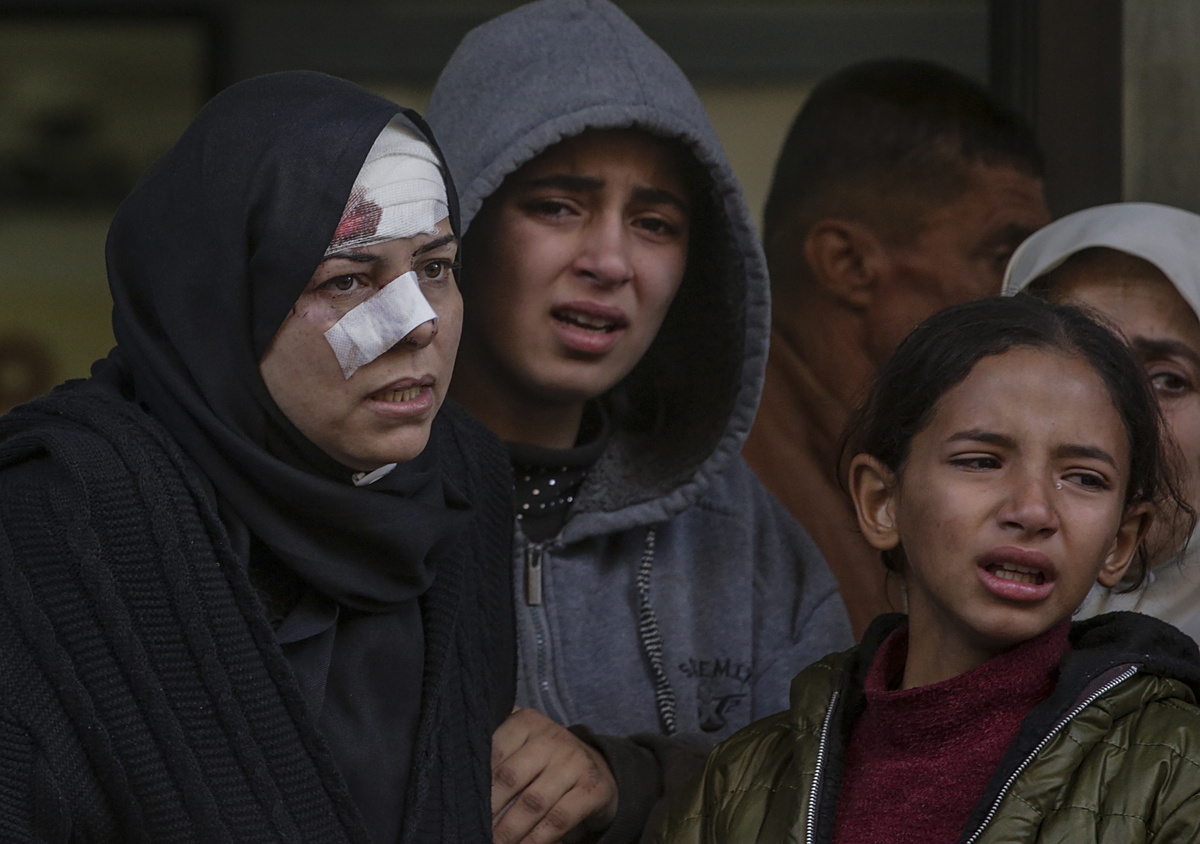 epa11774380 Palestinians, among them an injured woman, mourn near the bodies of their relatives killed after an Israeli air strike, in Al Nuseirat refugee camp, central Gaza Strip, 13 December 2024. According to the Palestinian Ministry of Health in Gaza, at least 40 Palestinians were killed in an overnight Israeli airstrike in Al Nusairat refugee camp, central Gaza. More than 45,500 Palestinians and over 1,400 Israelis have been killed, according to the Palestinian Health Ministry and the Israeli Army, since Hamas militants launched an attack against Israel from the Gaza Strip on 07 October 2023 and the Israeli operations in Gaza and the West Bank that followed it. EPA/MOHAMMED SABER