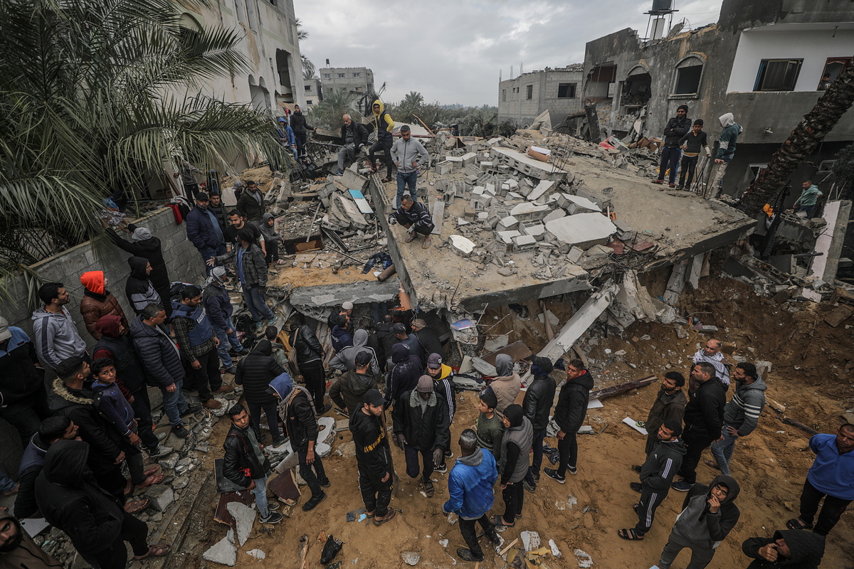 epa11203708 Palestinians search for missing people under the rubble of a destroyed house following an Israeli air strike, south of Deir Al Balah, southern Gaza Strip, 07 March 2024. More than 30,500 Palestinians and over 1,300 Israelis have been killed, according to the Palestinian Health Ministry and the Israel Defense Forces (IDF), since Hamas militants launched an attack against Israel from the Gaza Strip on 07 October 2023, and the Israeli operations in Gaza and the West Bank which followed it. EPA/MOHAMMED SABER