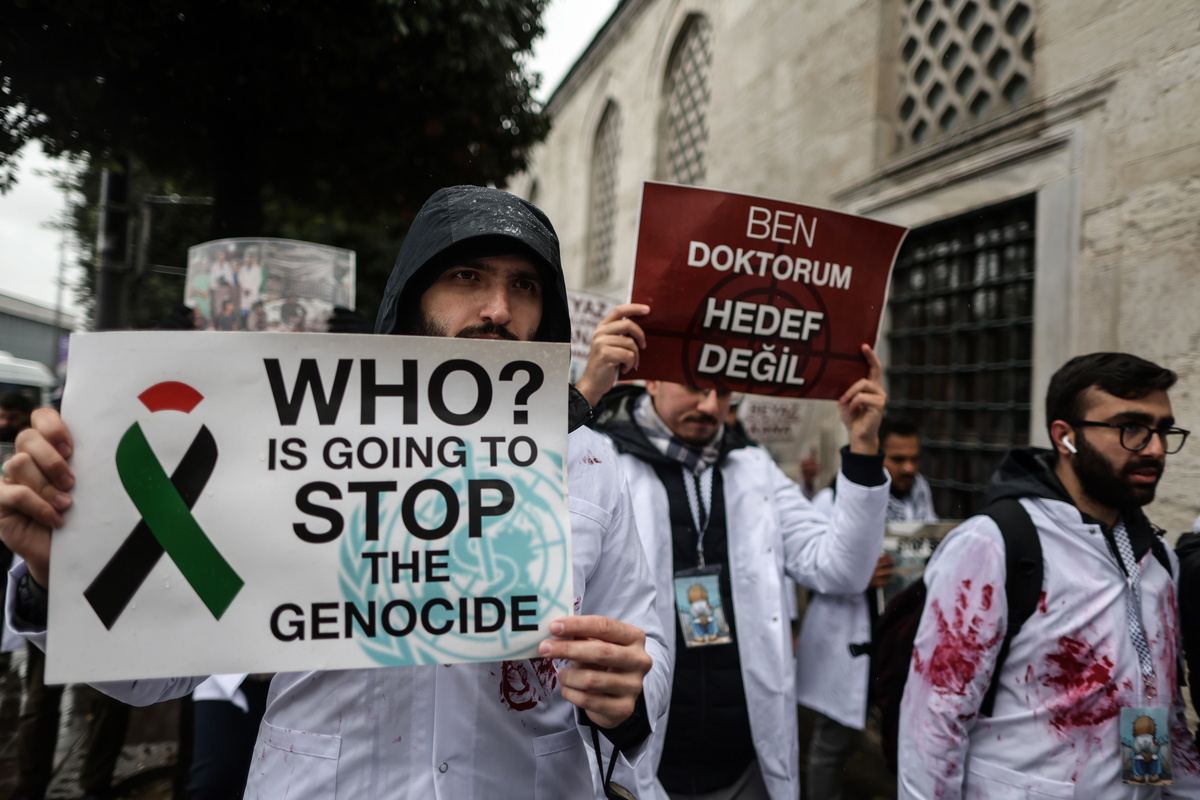 epa11019059 Doctors hold placards during a march to protest against Israel's attack to hospitals in Gaza, in Istanbul, Turkey, 09 December 2023. Thousands of Israelis and Palestinians have died since the militant group Hamas launched an unprecedented attack on Israel from the Gaza Strip on 07 October, and the Israeli strikes on the Palestinian enclave which followed it. EPA/ERDEM SAHIN