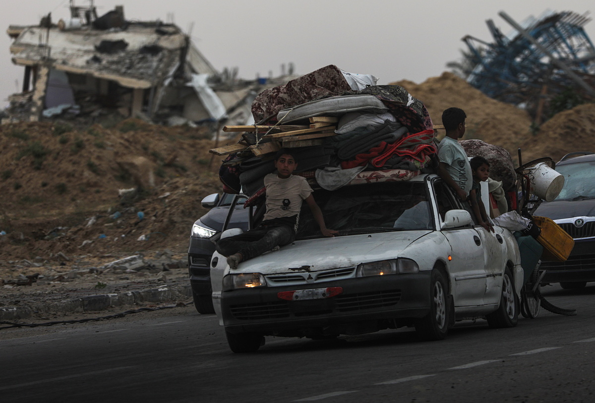 epa11332155 Internally displaced Palestinians leave with their belongings following an evacuation order issued by the Israeli army, in Rafah, southern Gaza Strip, 10 May 2024. The Israeli military stated on 07 May that it conducted 'targeted strikes' against Hamas targets in eastern Rafah in the southern Gaza Strip. More than 34,900 Palestinians and over 1,455 Israelis have been killed, according to the Palestinian Health Ministry and the IDF, since Hamas militants launched an attack against Israel from the Gaza Strip on 07 October 2023, and the Israeli operations in Gaza and the West Bank which followed it. EPA/MOHAMMED SABER