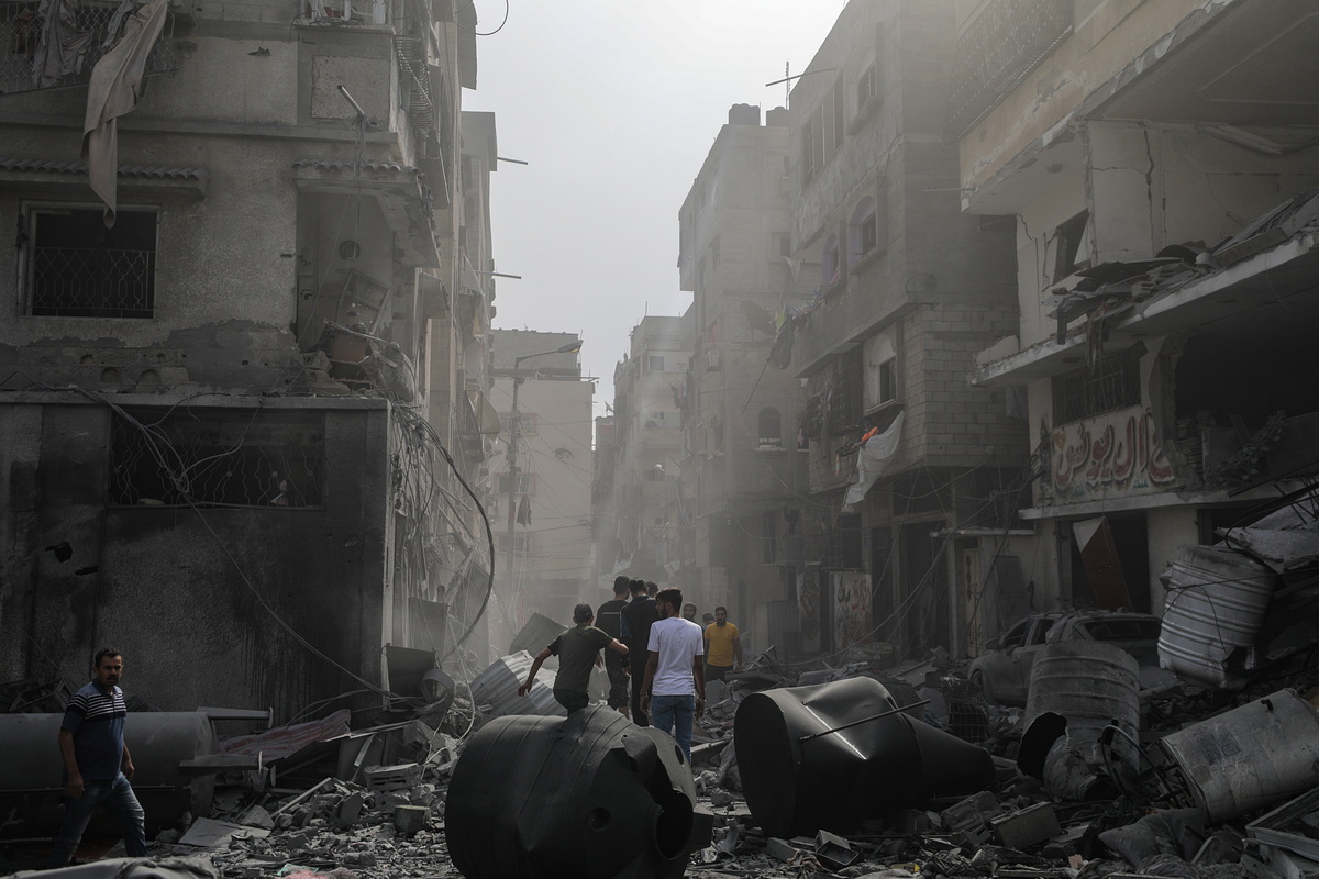epa10934112 Palestinians inspect a destroyed area after Israeli air strikes in Gaza City, 23 October 2023. More than 4,700 Palestinians and over 1,400 Israelis have been killed, according to the Israel Defense Forces (IDF) and the Palestinian health authority, since Hamas militants launched an attack against Israel from the Gaza Strip on 07 October. EPA/MOHAMMED SABER