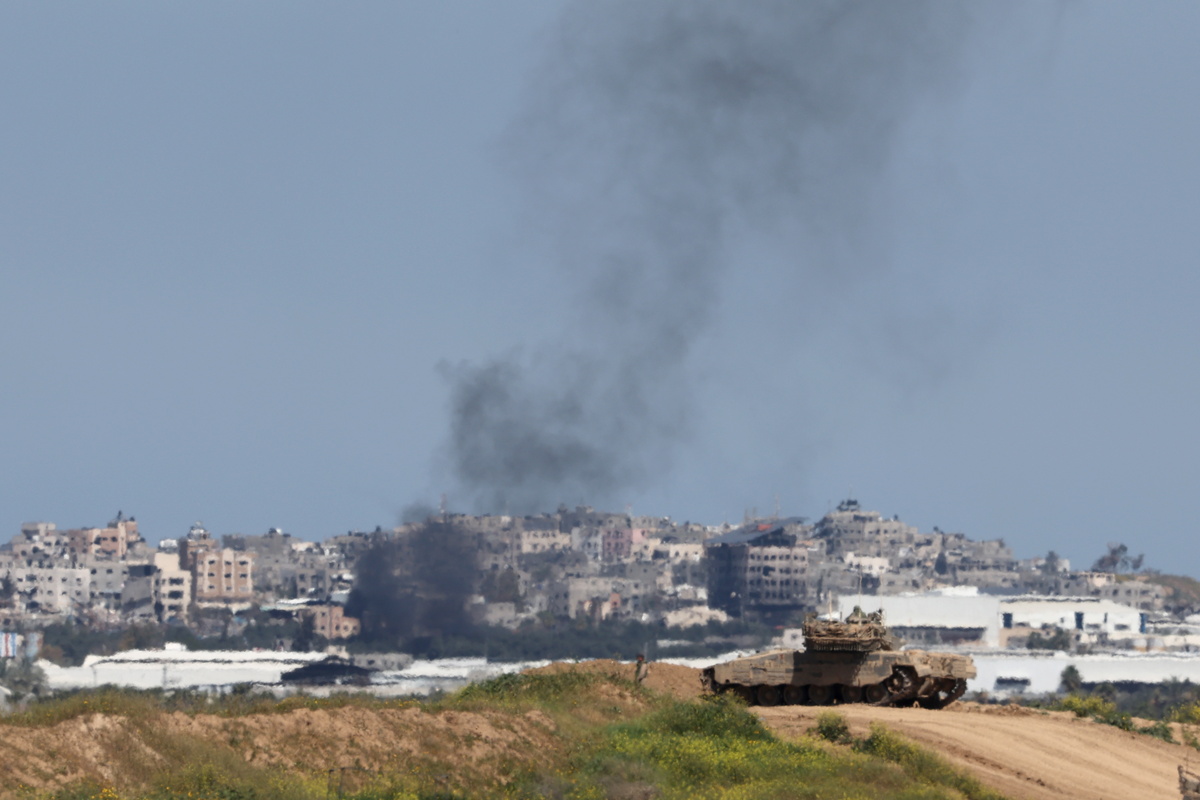 epa11213964 Smoke rises from the Gaza Strip as an Israeli tank maneuvers near the border fence, as seen from an undisclosed location in southern Israel, 11 March 2024. More than 31,000 Palestinians and over 1,300 Israelis have been killed, according to the Palestinian Health Ministry and the Israel Defense Forces (IDF), since Hamas militants launched an attack against Israel from the Gaza Strip on 07 October 2023, and the Israeli operations in Gaza and the West Bank which followed it. EPA/ABIR SULTAN