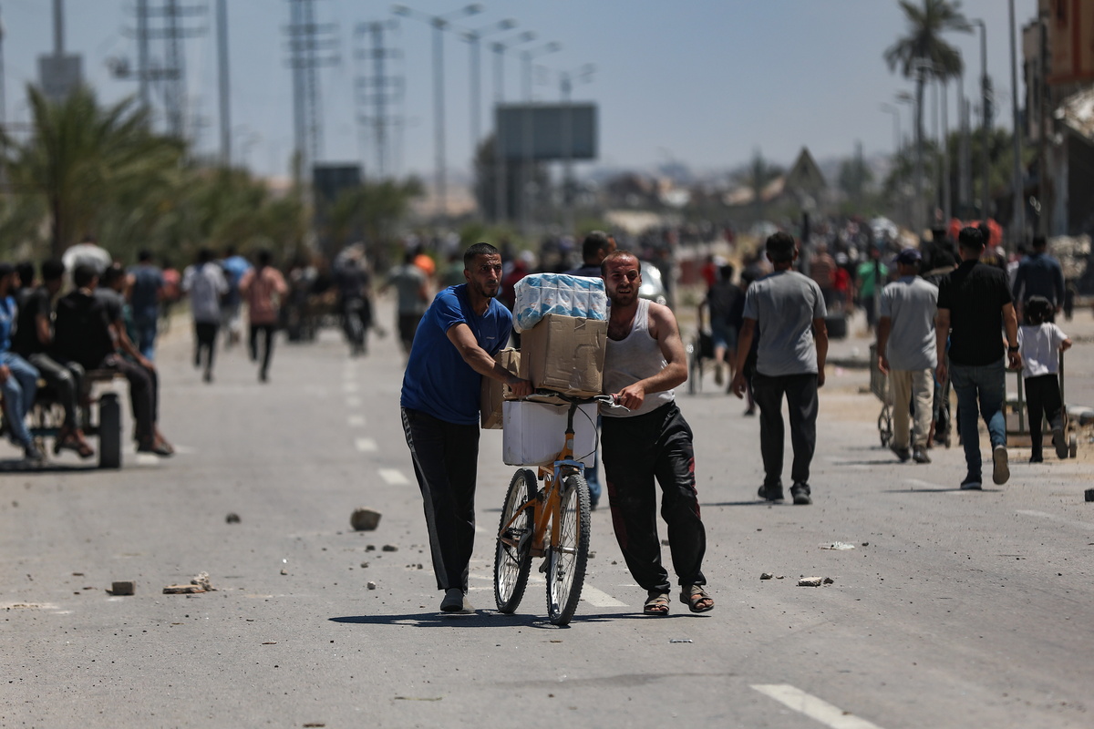 epa12143213 Palestinians carry aid supplies received from the US-backed Gaza Humanitarian Foundation through an area known as the Netzarim Corridor, central Gaza Strip, 29 May 2025. According to the UN half a million people, or one in five people in the Strip are facing starvation while the entire population of the Gaza Strip continues to face a critical risk of famine following 19 months of conflict, mass displacement and severe restrictions on humanitarian aid. EPA/HAITHAM IMAD