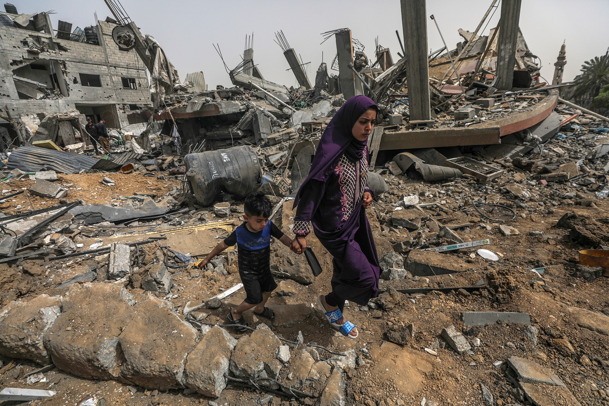 epa11286352 Palestinians return to Al Nusairat refugee camp after the Israeli army’s withdrawal from the area, southern Gaza Strip, 18 April 2024. More than 33,900 Palestinians and at least 1,450 Israelis have been killed, according to the Palestinian Health Ministry and the Israel Defense Forces (IDF), since Hamas militants launched an attack against Israel from the Gaza Strip on 07 October 2023, and the Israeli operations in Gaza and the West Bank which followed it. EPA/MOHAMMED SABER